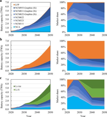در تحلیل‌های مربوط به باتری‌های لیتیوم-گوگرد و لیتیوم-هوا نیز در نظر گرفته می‌شود که در آینده باتری‌های حالت جامد لیتیوم فلزی، به ویژه باتری‌های Li-S و Li-Air پیشرفت قابل توجهی خواهند داشت. البته باتری‌های Li-S و Li-Air هنوز در مراحل اولیه توسعه هستند و چالش‌های قابل توجهی در مورد آن‌ها باید تا قبل از تجاری‌سازی حل شود. با این وجود در این تحلیل فرض می‌شود که این نوع باتری‌ها در سال 2030 وارد بازار می شود و تا سال 2040 حدود 60 درصد از سهم بازار را تامین می‌کند، و بقیه بازار را خودروهای NCA و NCM تامین می‌کند.