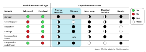 خواصی از قبیل هدایت حرارتی، چگالی، ضخامت، حداکثر دمای حفاظت در برابر آتش و هزینه برای انتخاب مواد بهینه حفاظت در برابر آتش کلیدی هستند. هر یک از این عوامل به تنهایی مهم هستند اما باید در سطح پک باتری در نظر گرفته شوند. یک ماده می تواند بسیار سبک وزن باشد، اما اگر مقدار زیادی از آن برای محافظت لازم باشد، ممکن است بهترین راه حل نباشد. به همین ترتیب، اگر یک ماده باید با مواد دیگر ترکیب شود تا تمام عملکردهای لازم را ارائه دهد، ممکن است بر عملکرد و مقرون به صرفه بودن آن تأثیر بگذارد.